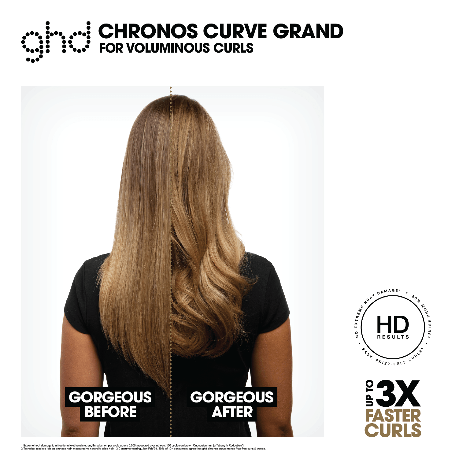 ² Consumer testing, Jan-Feb’24. an average of 73% of 921 consumers agree that ghd chronos curve makes frizz-free curls & waves.