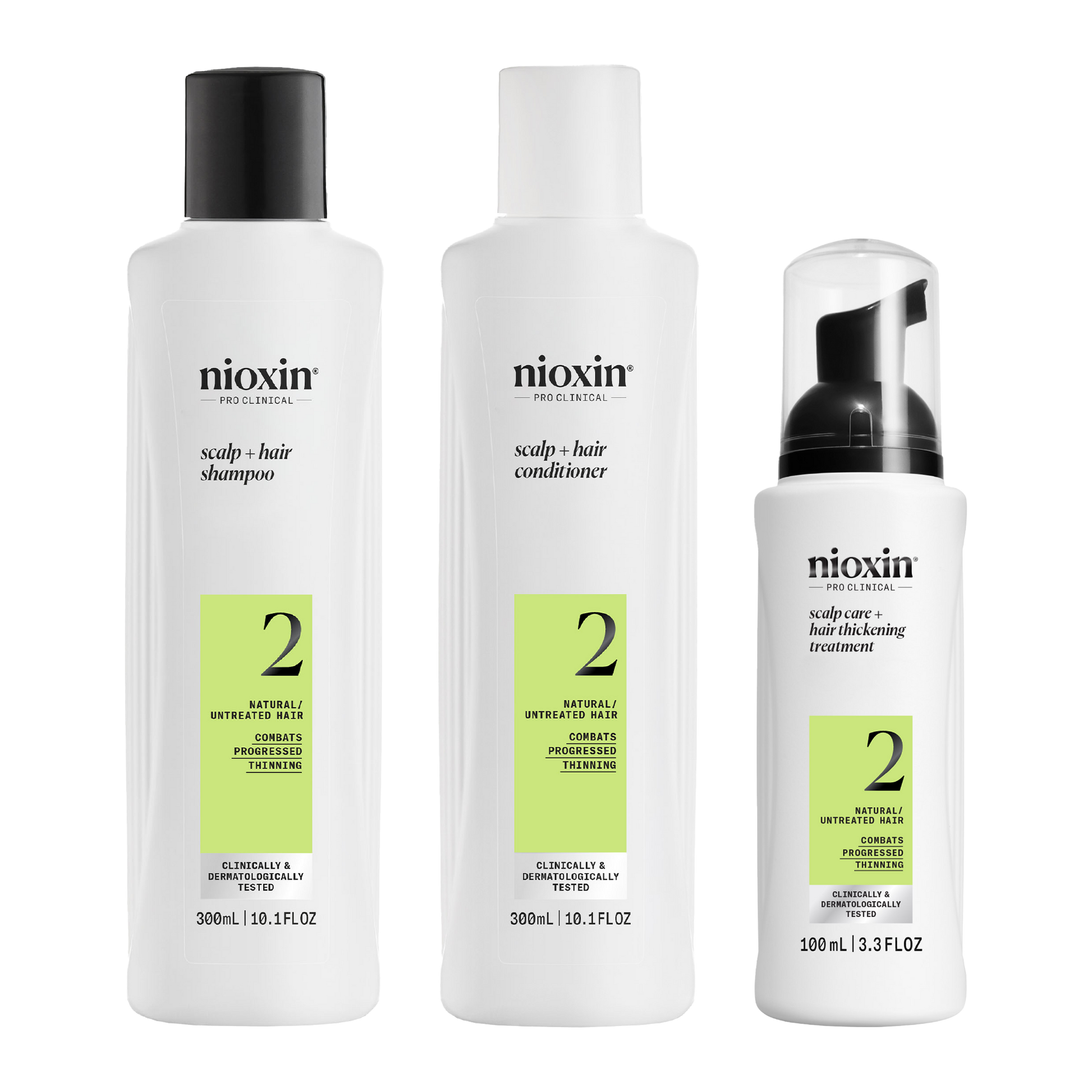 Nioxin Pro Clinical's System Kit 2 is designed for natural, untreated hair with progressed thinning. Clinically and dermatologically tested, this complete scalp & hair thickening system thickens and boosts your hair's density. 8 out 10 users saw thicker, fuller hair in 30 days! Formulated with a powerful blend of niacinamide, biotin and caffeine to help nourish the hair root, stimulate hair follicles and strengthen the hair.